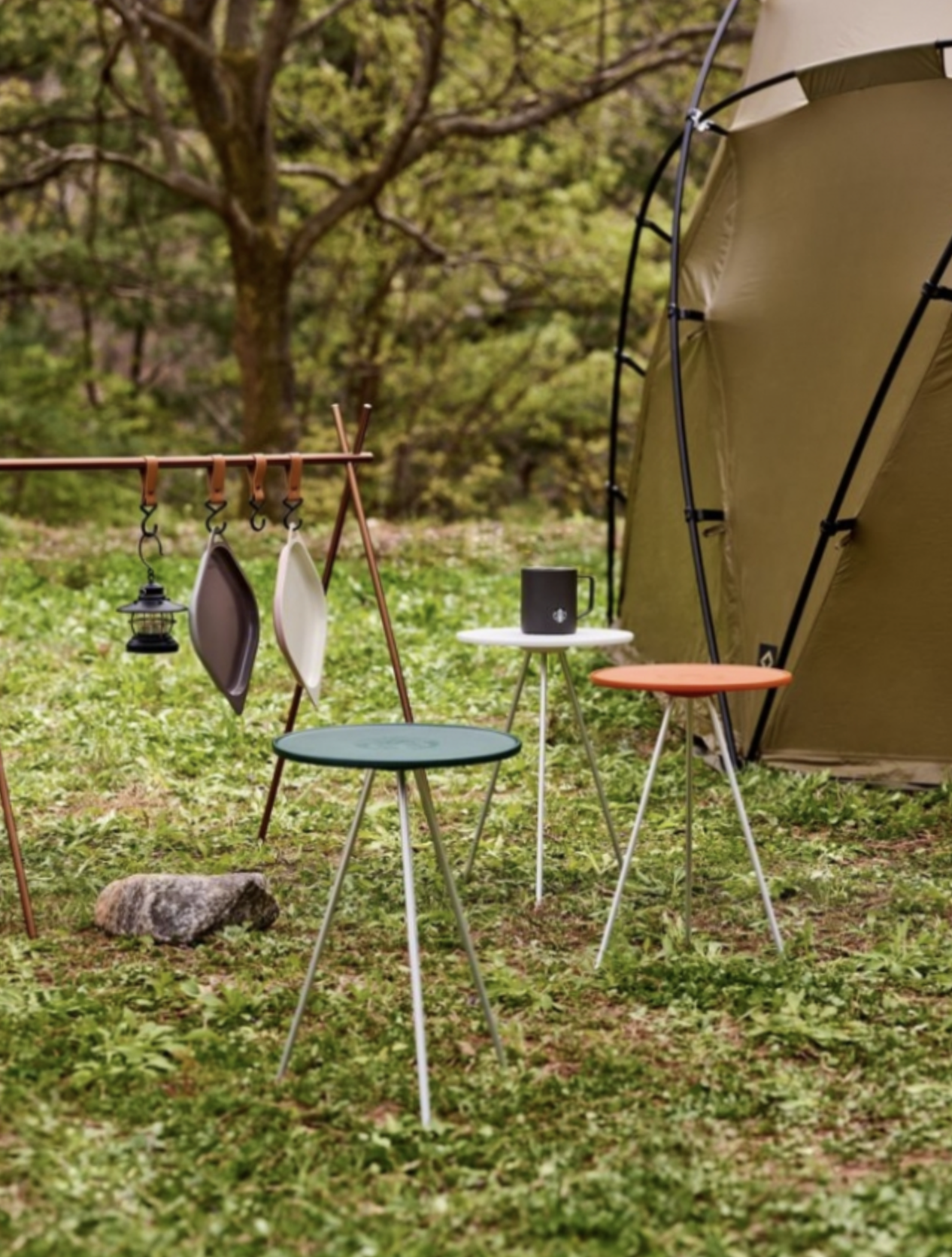 2023 스타벅스 서머 e프리퀀시 증정품 - 팬앤플레이트 두 가지 제품을 캠핑에 활용한 사진입니다. 플레이트와 테이블의 조화가 자연과 잘 어우러지는 듯합니다.